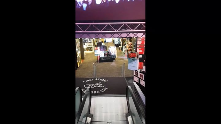 Durante a descida da escada rolante, um telão à frente dos olhos projetava imagens de uma plateia pulsante em um grande concerto de rock, dando a perspectiva de quem entra na loja de estar em cima de um palco, se apresentando a uma multidão.